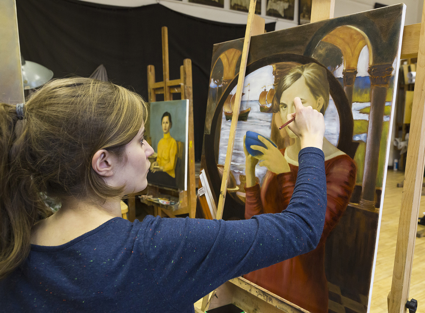 Na IV roku studenci wykonują studium malarskie własnego autoportretu utrzymanego w konwencji wybranego portretu autorstwa jednego z mistrzów malarstwa z okresu od XVI w. do I poł. XX w. W procesie twórczym korzystają z reprodukcji wybranego portretu, tworząc obraz na podstawie swojego zdjęcia, które w warstwie kostiumowej, kompozycyjnej i światłocieniowej nawiązuje do obranego wzorca, a także na podstawie studium rysunkowego autoportretu, które realizowane jest w ramach Pracowni rysunku, w semestrze letnim na III roku studiów. Fotografie realizowane są w Pracowni fotograficznej przez pracownika katedry Adama Fisza.